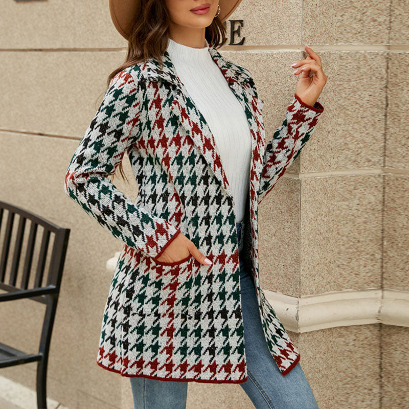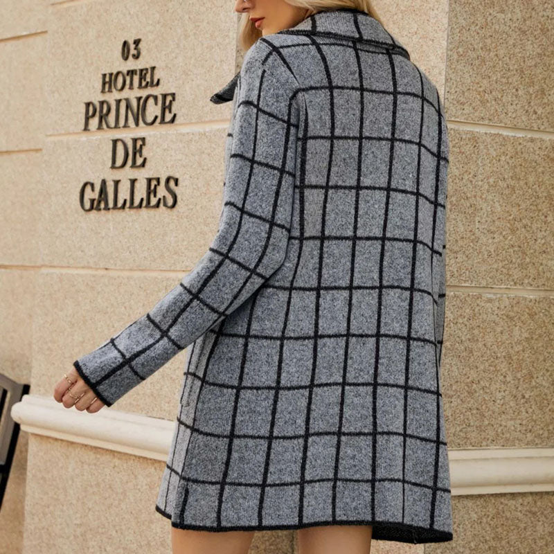 Dieser lange Mantel zeichnet sich durch ein durchgehendes Muster und eine strukturierte Form mit offenem Vorderteil aus. Das Design umfasst einen taillierten Reverskragen und lange Ärmel. Die Länge bietet zusätzlichen Schutz, während der gerade Saum einen klaren Abschluss verleiht. Sichtbare Taschen an den Seiten runden das Design ab.