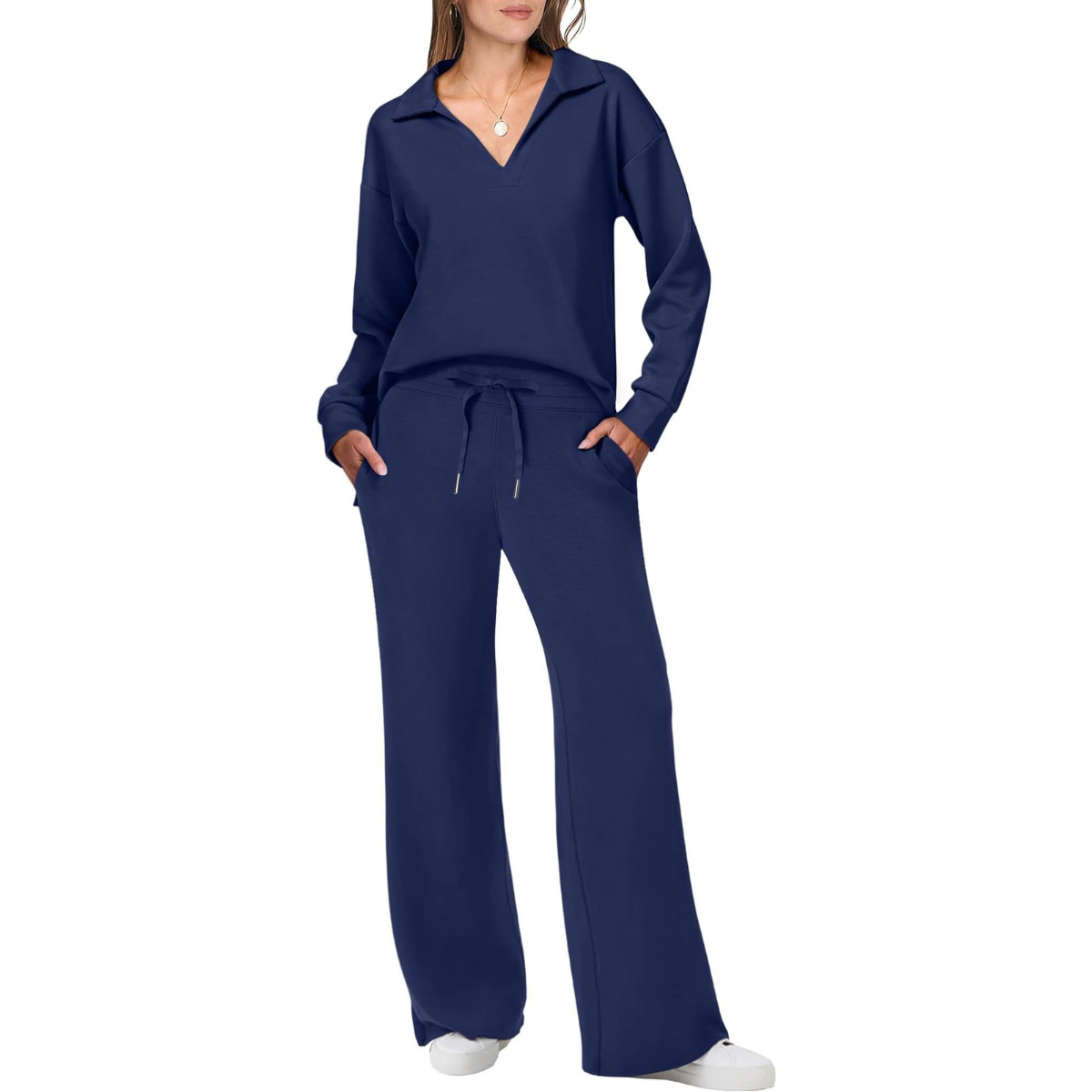 Dieses Set besteht aus einem langärmeligen Oberteil mit Kragen und V-Ausschnitt sowie passenden Hosen. Die Hose hat einen Kordelzugbund und seitliche Taschen. Der Stoff fällt glatt, und der weite Schnitt sorgt für eine klare Form.