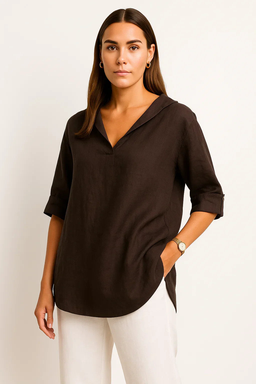 Diese moderne Bluse bringt zeitlosen Chic in deinen Alltag und überzeugt durch ihre leichte, fließende Silhouette. Der V-Ausschnitt sorgt für eine elegante Note, während die entspannte Passform angenehme Bewegungsfreiheit garantiert. Ideal für warme Tage und vielseitige Looks, ob im Büro, beim Stadtbummel oder beim Dinner mit Freunden. Ihr schlichtes Design lässt sich mühelos stylen und bietet unzählige Möglichkeiten für einen stilvollen Auftritt.
