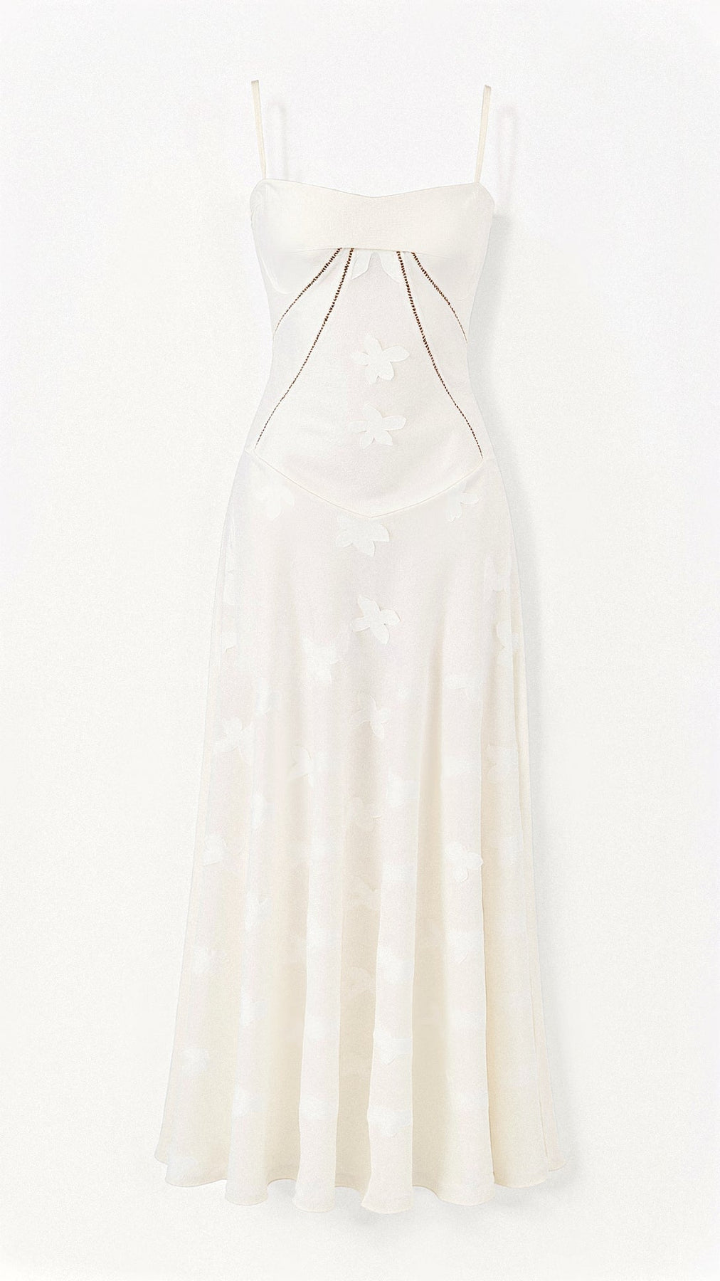 Verwandeln Sie jeden Moment in pure Magie mit unserem elfenhaften Maxikleid "Luna". Dieses atemberaubende Kleid fängt das Licht und die Blicke mit seinem einzigartigen Design ein. Gefertigt aus einem zarten, halbtransparenten Stoff, in den filigrane Schmetterlinge eingewebt sind, erzeugt es bei jeder Bewegung ein Gefühl von schwereloser Leichtigkeit. Das strukturierte Bustier-Top mit seinen feinen Spaghettiträgern sorgt für Halt und setzt Ihr Dekolleté kunstvoll in Szene, veredelt durch feine, goldfarbene Zierketten, die sanft über die Taille fallen. Der Schnitt geht sanft in einen bodenlangen A-Linien-Rock über, der Ihre Figur umspielt und eine ätherische Silhouette zeichnet. Getragen über einem schlichten Body oder einem kurzen Unterkleid ist "Luna" das perfekte Kleid für Ihren Ibiza-Urlaub, eine romantische Strandhochzeit oder eine unvergessliche Festival-Nacht.