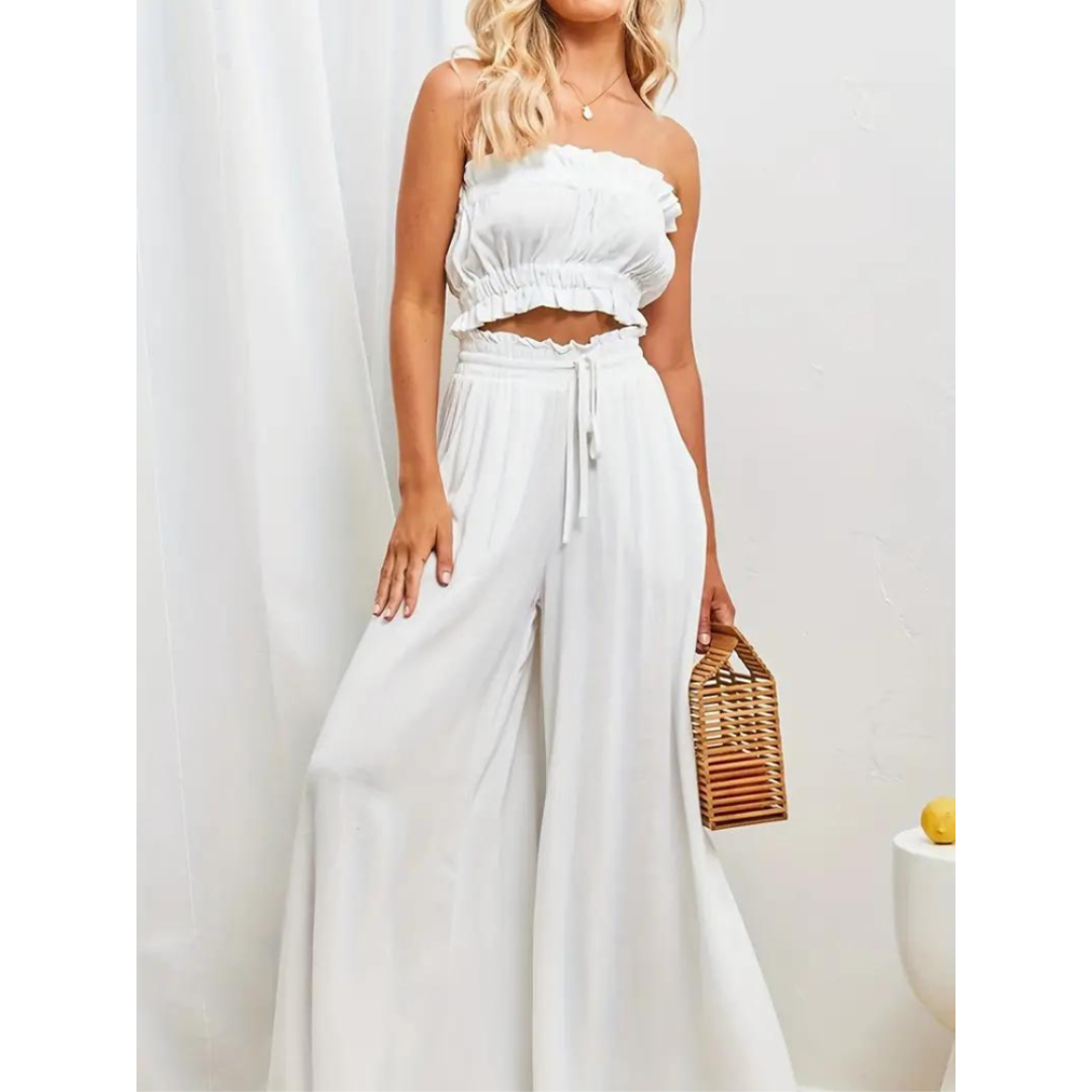 Diese Hose hat einen weiten Schnitt mit hoher Taille und einen elastischen Bund mit Raffung. Sie verfügt über einen Kordelzug zur zusätzlichen Anpassung und praktische Seitentaschen. Das fließende Design verleiht der Hose ein zeitloses und schlichtes Erscheinungsbild – ideal für eine vielseitige Garderobe.